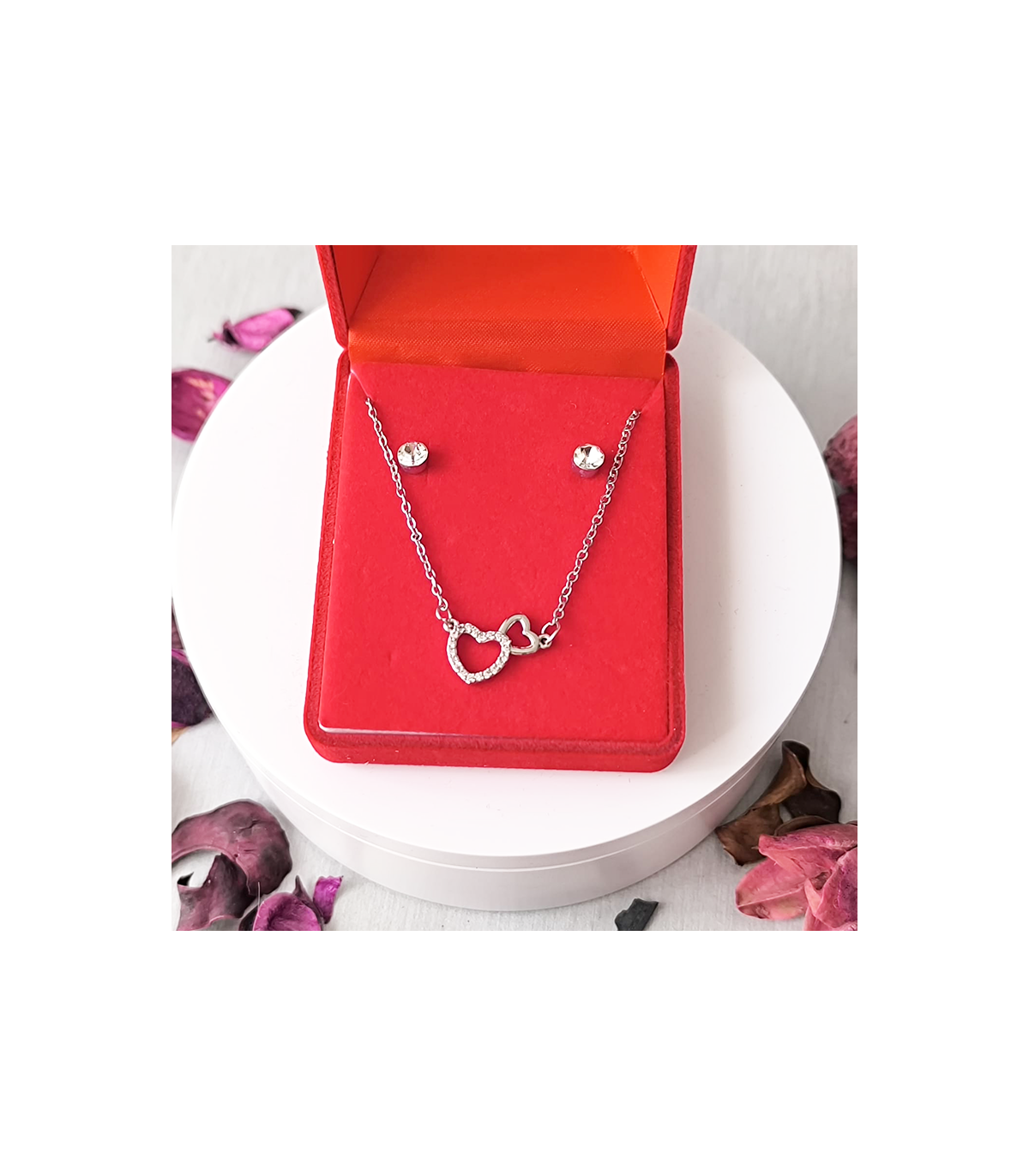 Juego de pendientes más collar en plateado.