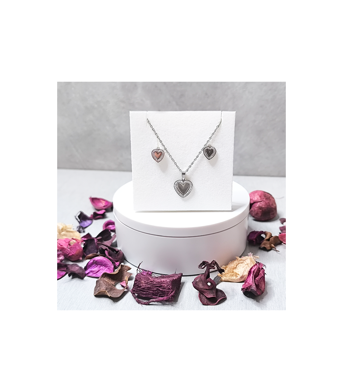 Juego de pendientes y collar en color Plateado Corazón con piedras, no se pone feo, aunque siempre recomendamos que se limpien las joyas con una gamuza especial de joyas, y así se mantendrán las joyas siempre limpias.