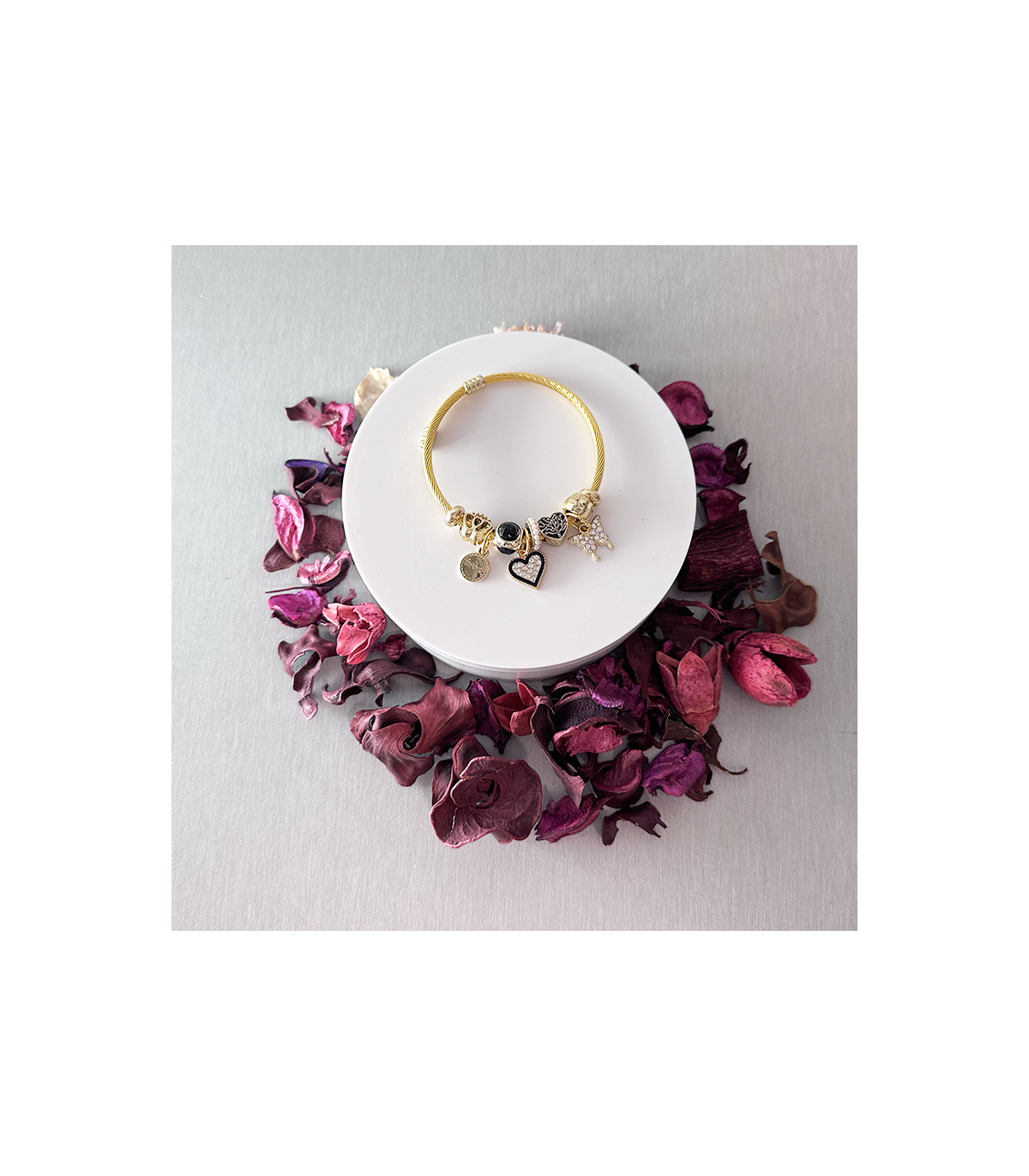 Pulsera de cordón de Acero Inoxidable Hipoalergénica "Dorada con adornos de Corazón Nacarado" no da alergia ni se pone fea, aunque siempre recomendamos limpiar las joyas con una gamuza especial, así las mantendrás siempre impecables.