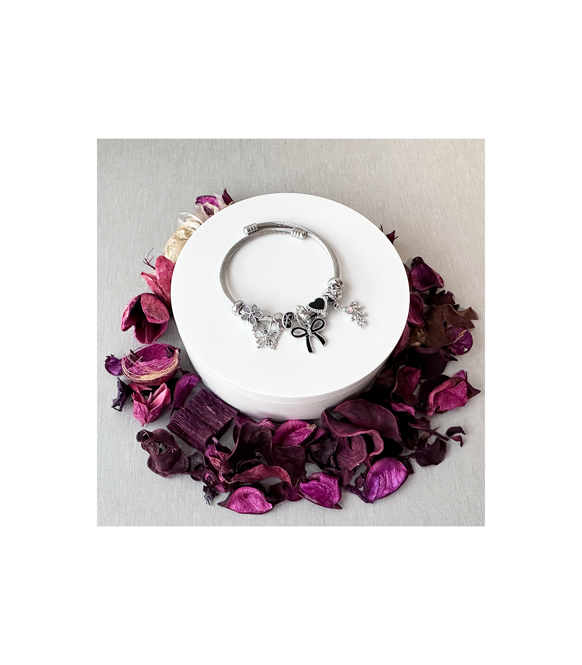 Pulsera de cordón de Acero Inoxidable Hipoalergénica "Plateada con adornos de lazo y brillantes" no da alergia ni se pone fea, aunque siempre recomendamos limpiar las joyas con una gamuza especial, así las mantendrás siempre impecables.