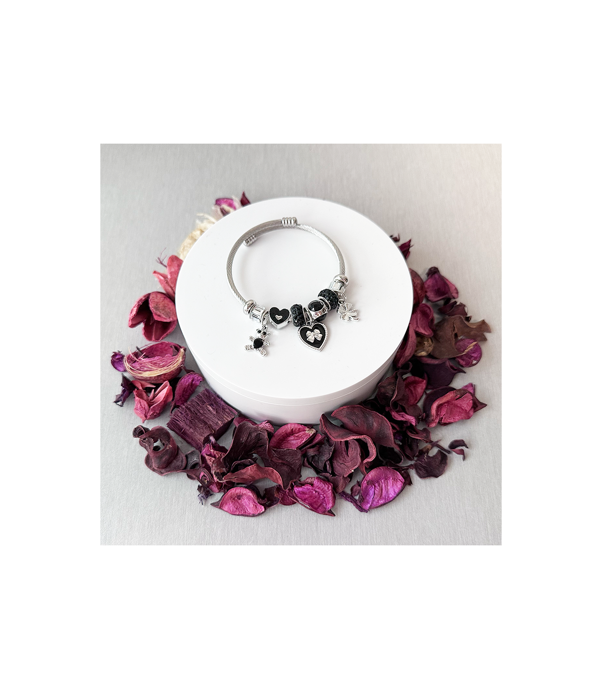 Pulsera - Acero hipoalergenico - Cordón Metálico Plateado con adornos - Corazón negro con lazo negro