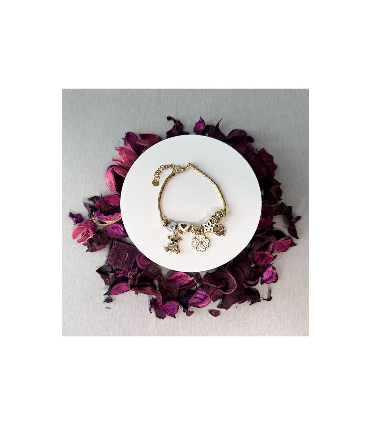 Pulsera de cordón de Acero Inoxidable Hipoalergénica "Dorada Flor blanca" no da alergia ni se pone fea, aunque siempre recomendamos limpiar las joyas con una gamuza especial, así las mantendrás siempre impecables.