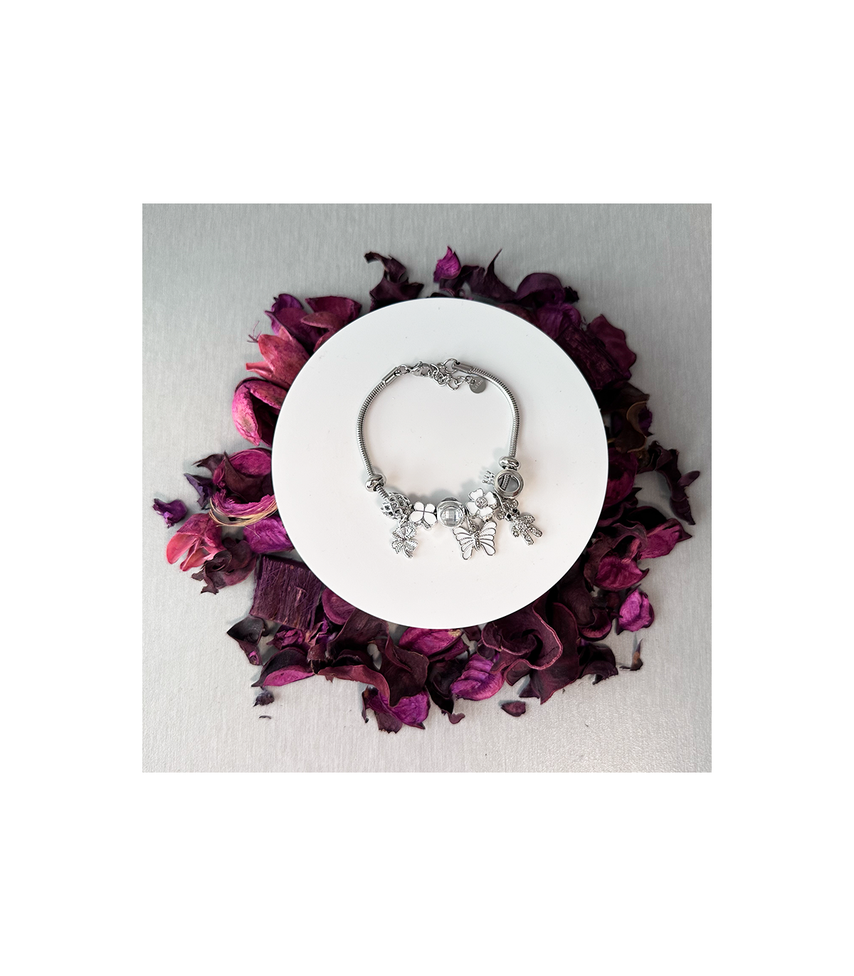 Pulsera de cordón de Acero Inoxidable Hipoalergénica "Plateada con Mariposa blanca" no da alergia ni se pone fea, aunque siempre recomendamos limpiar las joyas con una gamuza especial, así las mantendrás siempre impecables.