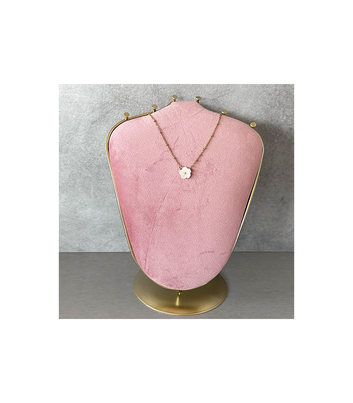 Collar con cadena, lleva de adorno un "Flor nacarada" de Acero Hipoalergénico. En Dorado.