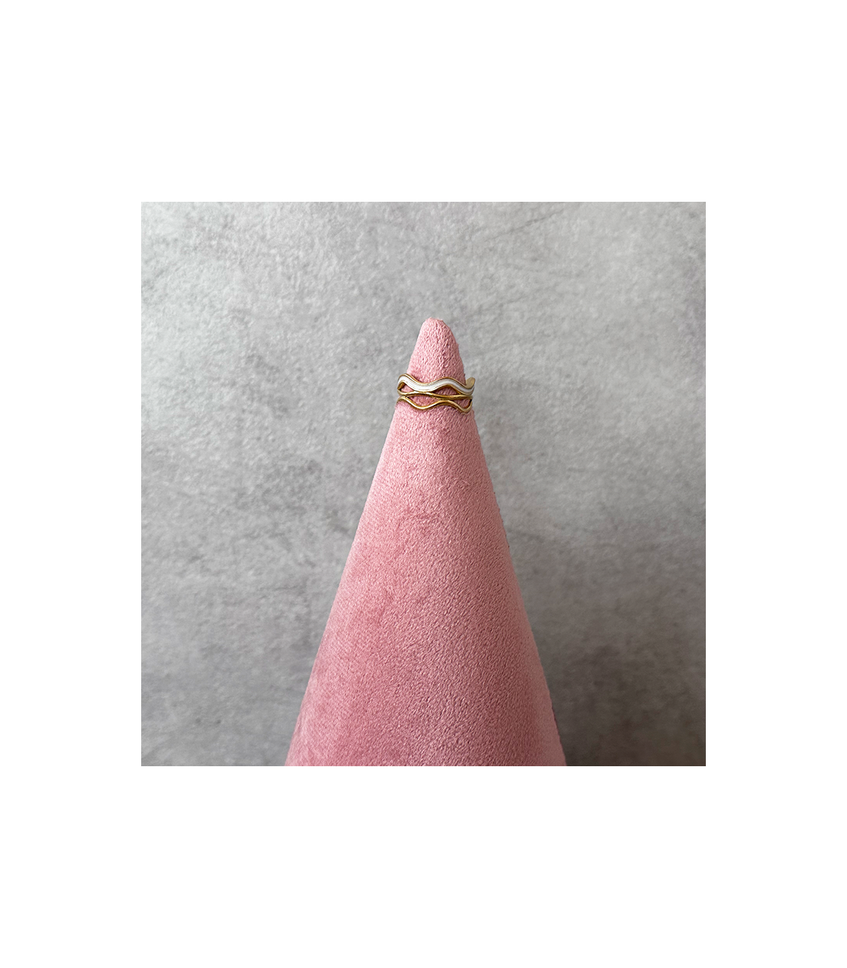 Anillo de ACERO color Dorado, no se pone feo, aunque recomendamos que se limpien con una gamuza para joyas y así se mantienen nuestras joyas siempre limpias. Es ondulado con una tira Nacarada.