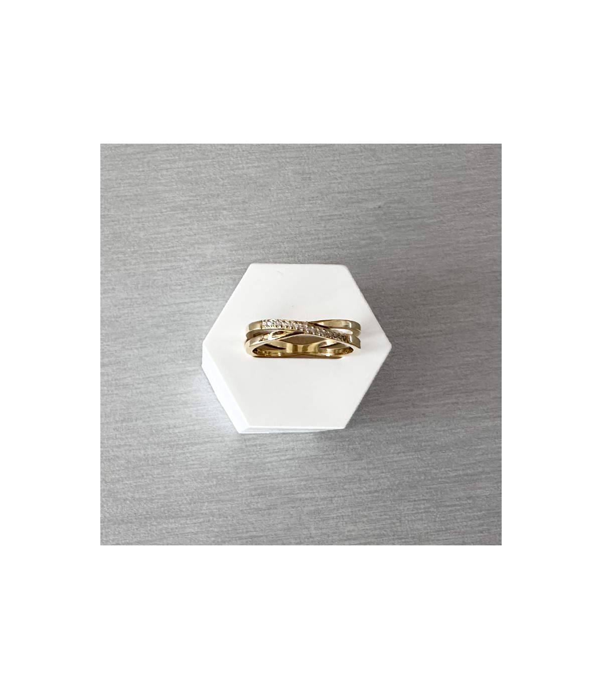 Anillo de ACERO color Dorado con brillantes, no se pone feo, aunque recomendamos que se limpien con una gamuza para joyas y así se mantienen nuestras joyas siempre limpias.