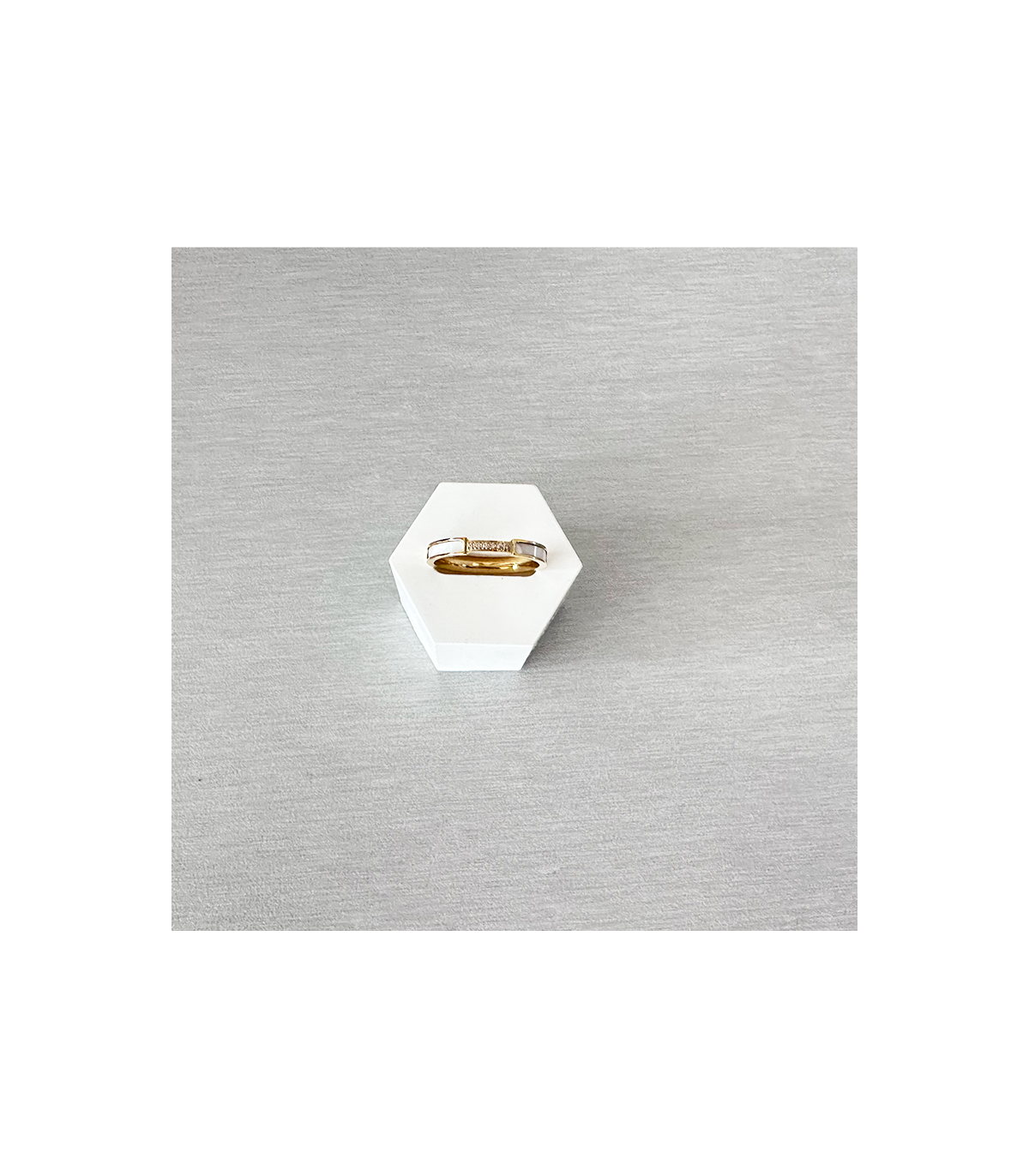 Anillo de ACERO color Dorado con brillantes, no se pone feo, aunque recomendamos que se limpien con una gamuza para joyas y así se mantienen nuestras joyas siempre limpias.