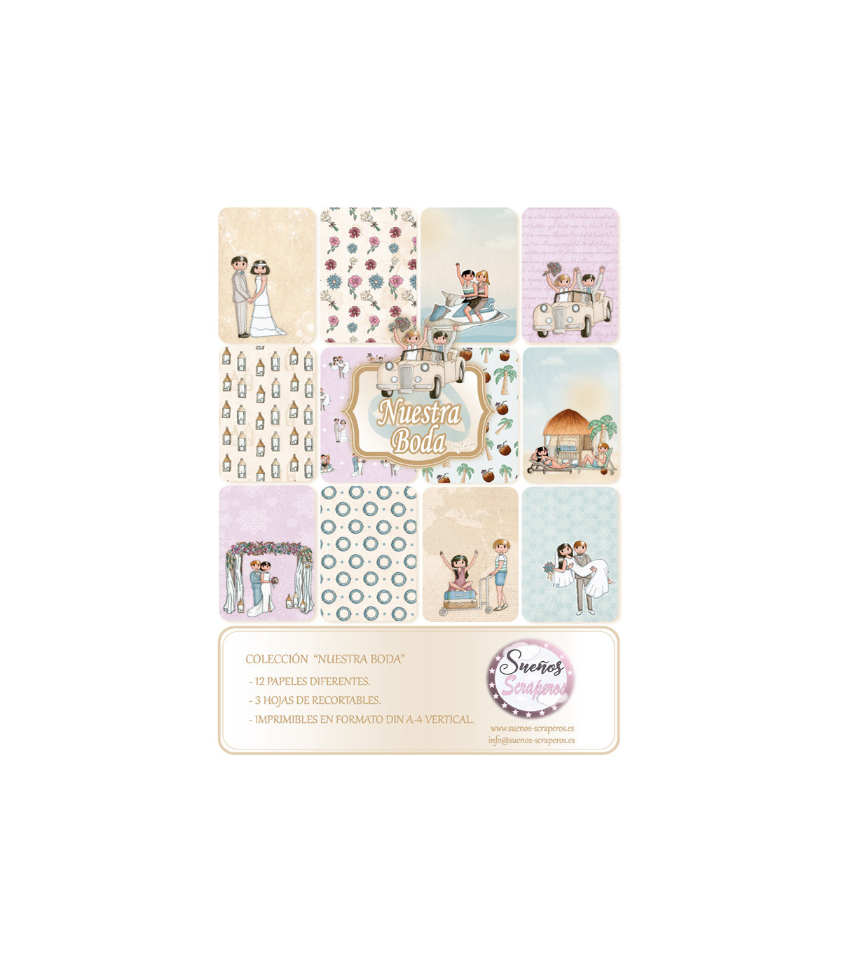 Colección digital de papeles para scrapbooking "Nuestra Boda" en formato VERTICAL Din A-4. Contiene doce papeles diferentes y tres hojas de recortables.