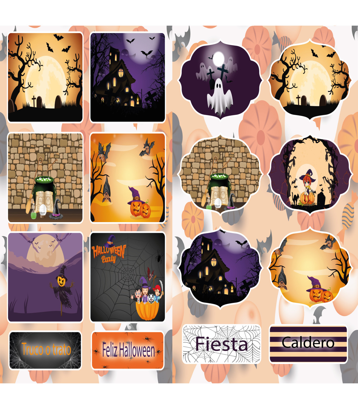 Colección digital de papeles para scrapbooking "Bienvenido Halloween" en formato HORIZONTAL Din A-4. Contiene ventiocho papeles diferentes y cinco hojas de recortables incluidos tres de Die Cut.