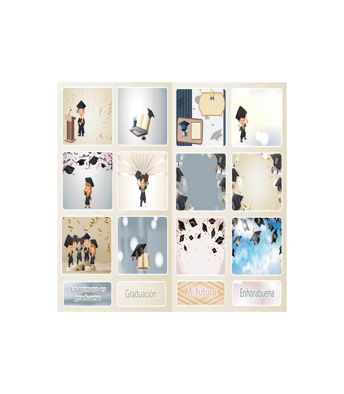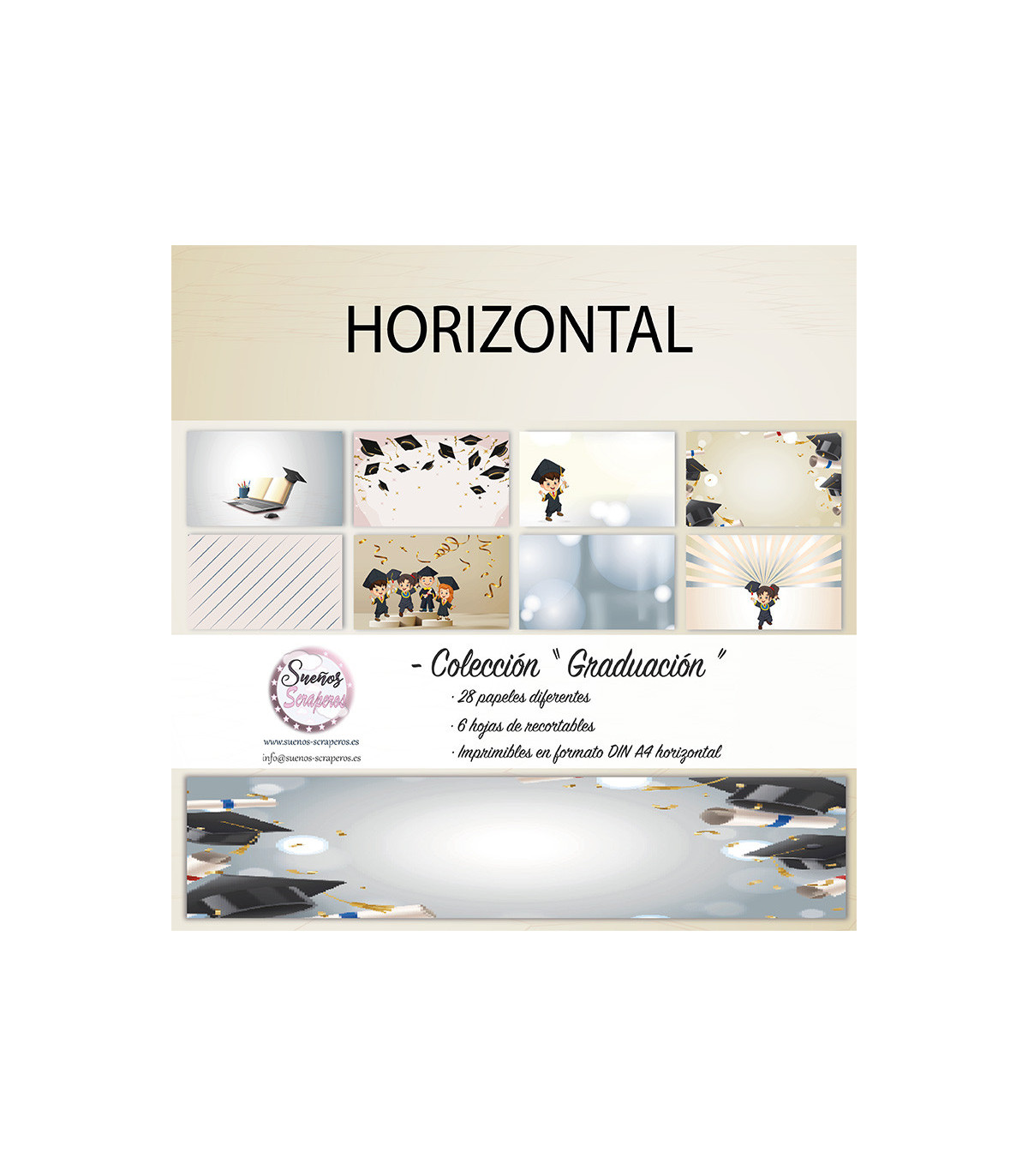 Colección digital de papeles para scrapbooking "Graduación" en formato HORIZONTAL Din A-4. Contiene ventiocho papeles diferentes y seis hojas de recortables incluidos tres de Die Cut.