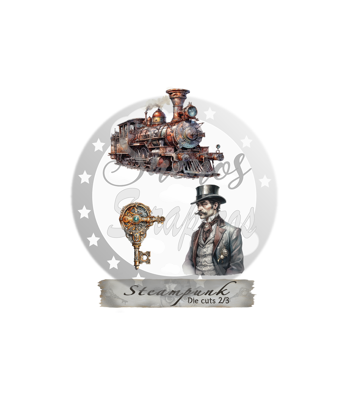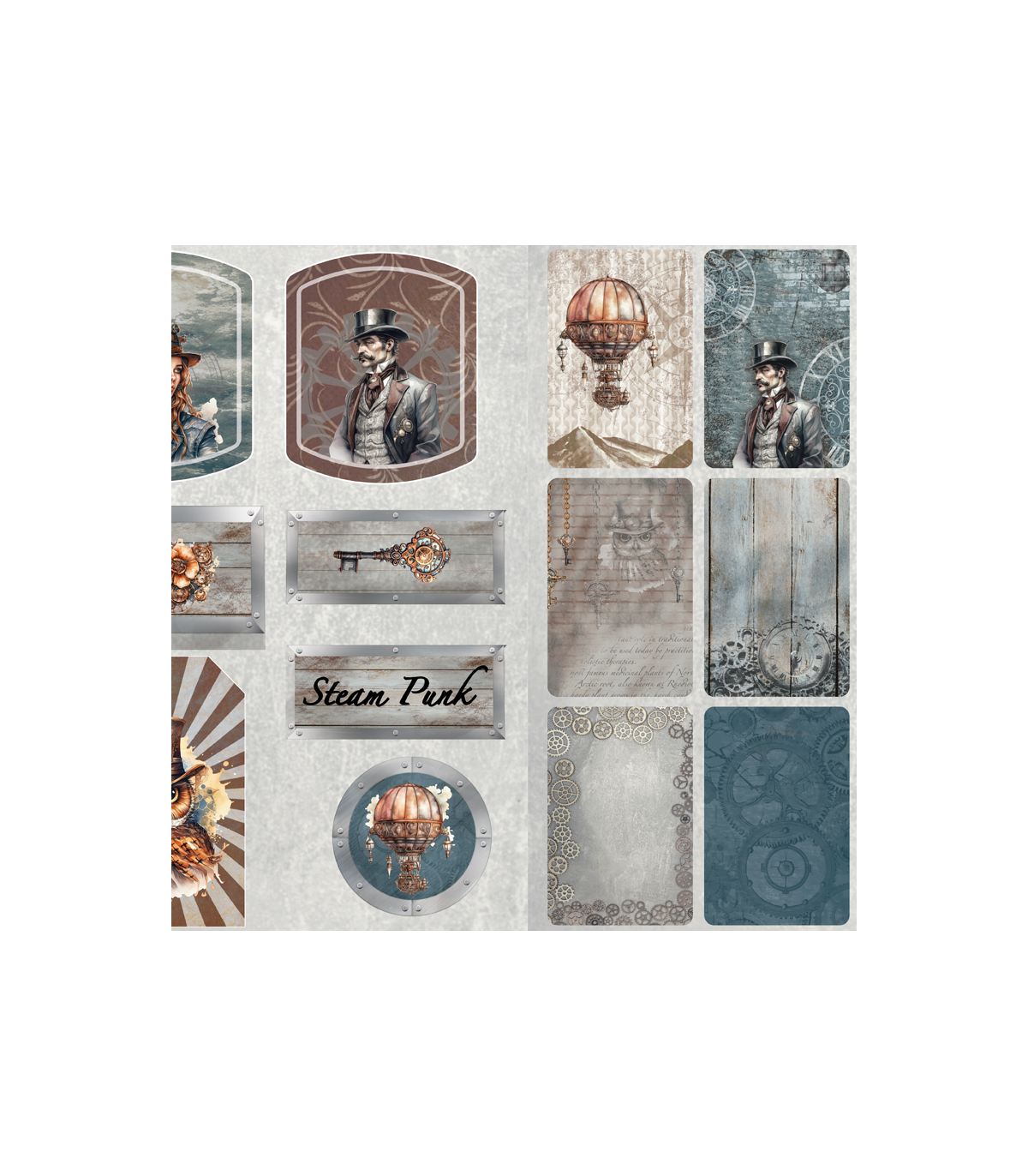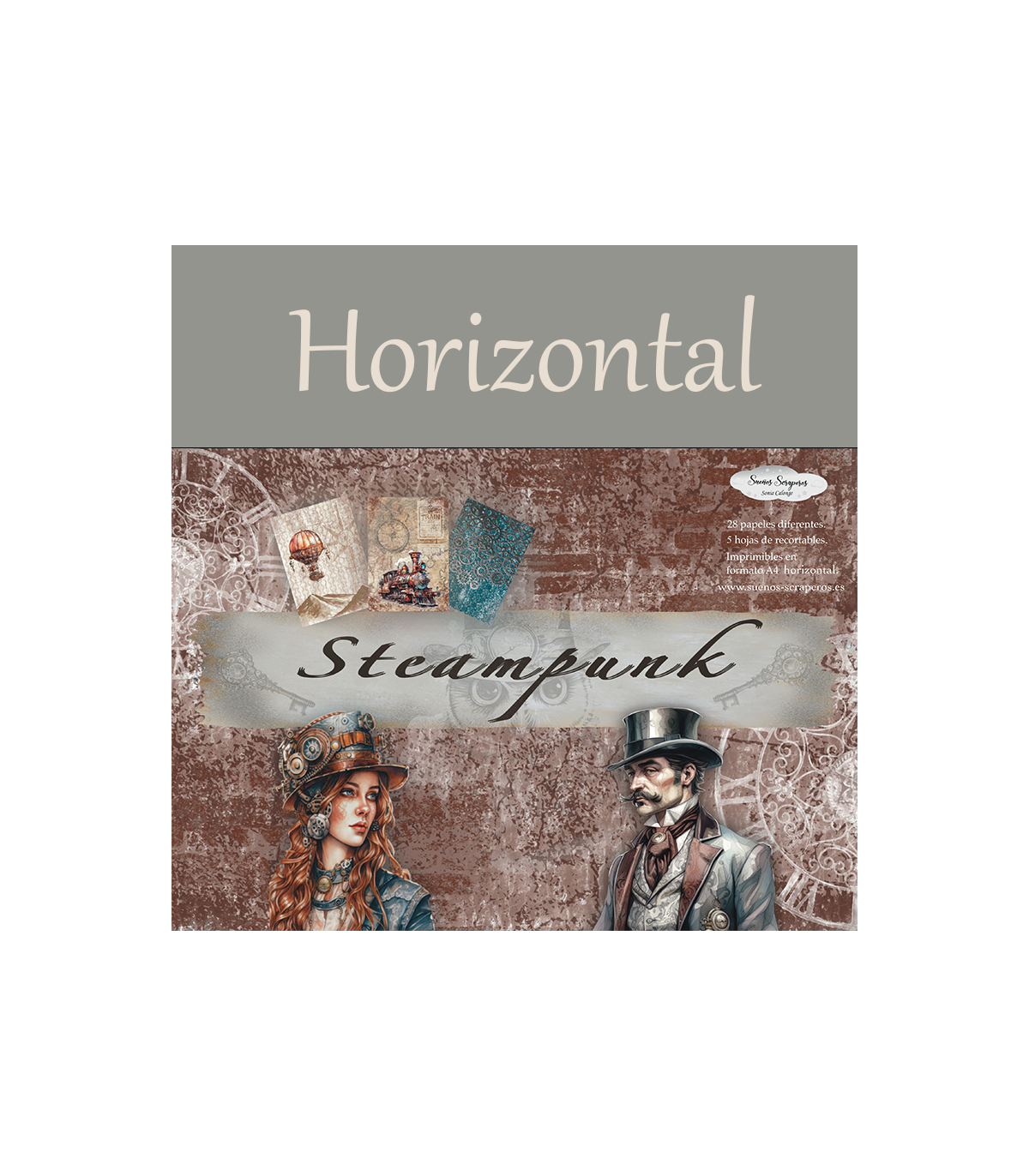 Colección digital de papeles para scrapbooking "Steampunk" en formato HORIZONTAL Din A-4. Contiene ventiocho papeles diferentes y cinco hojas de recortables incluidos tres de Die Cuts.