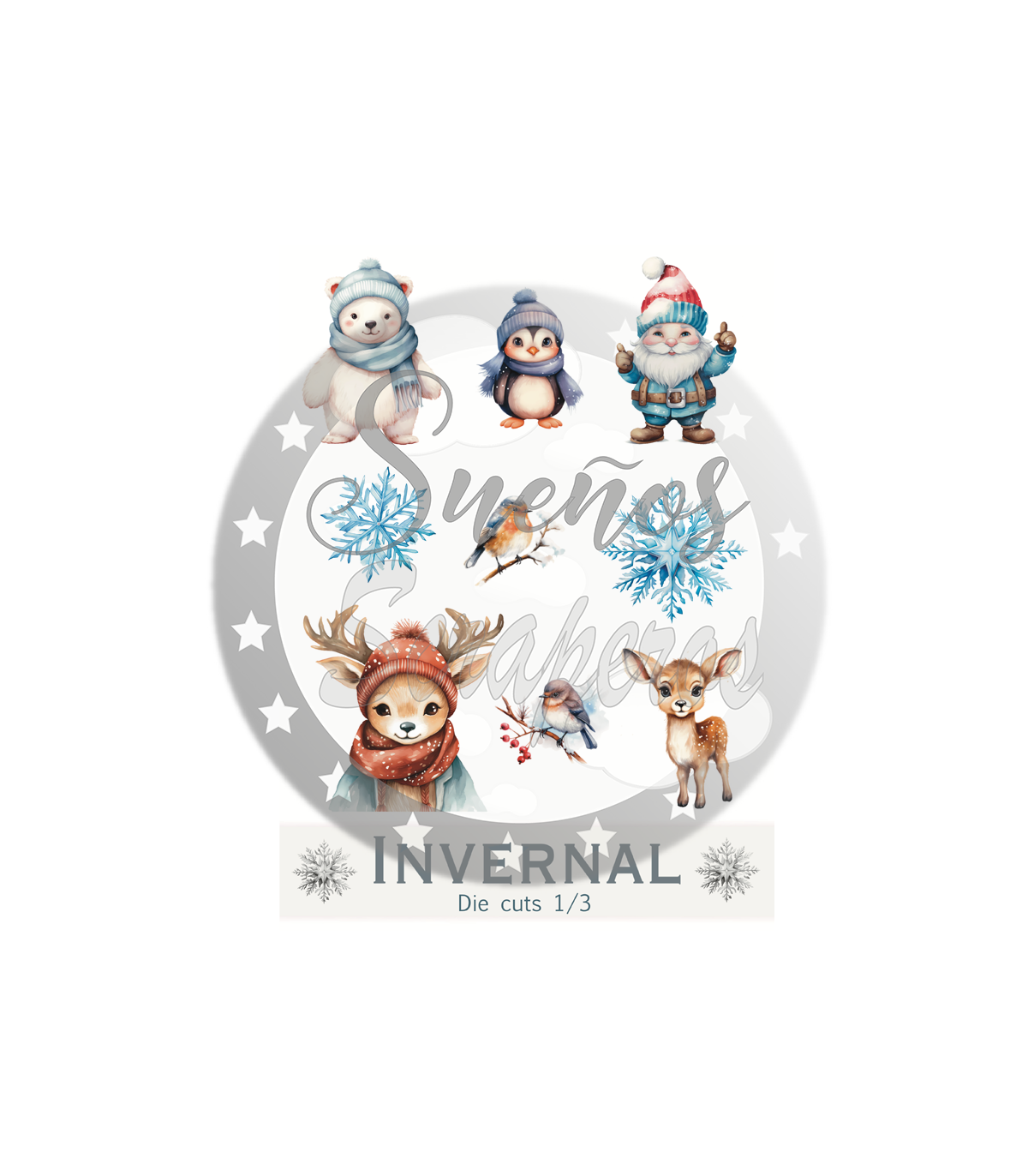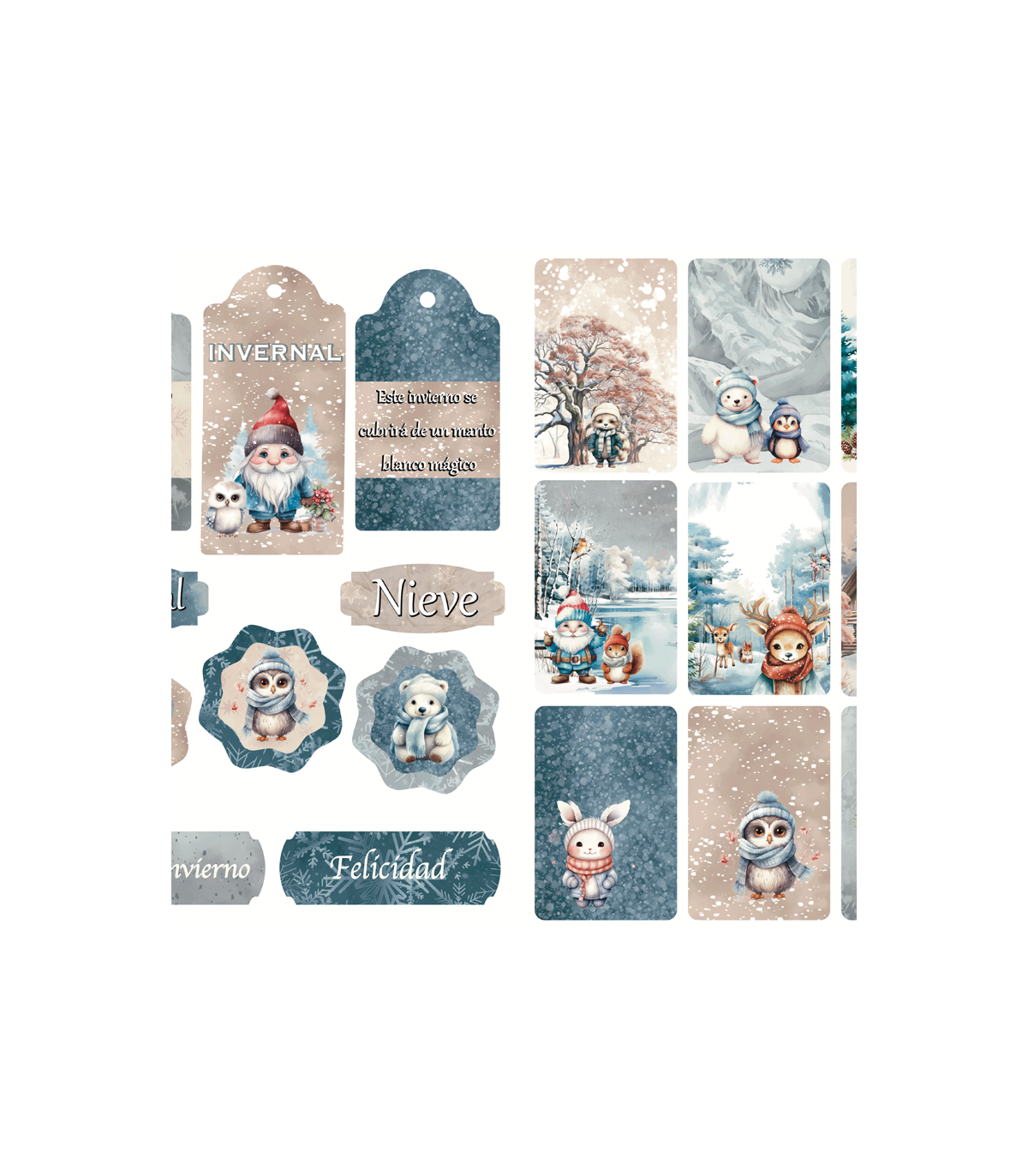 Colección digital de papeles para scrapbooking "Invernal" en formato VERTICAL Din A-4. Contiene ventiocho papeles diferentes y cinco hojas de recortables incluidos tres de Die Cuts.