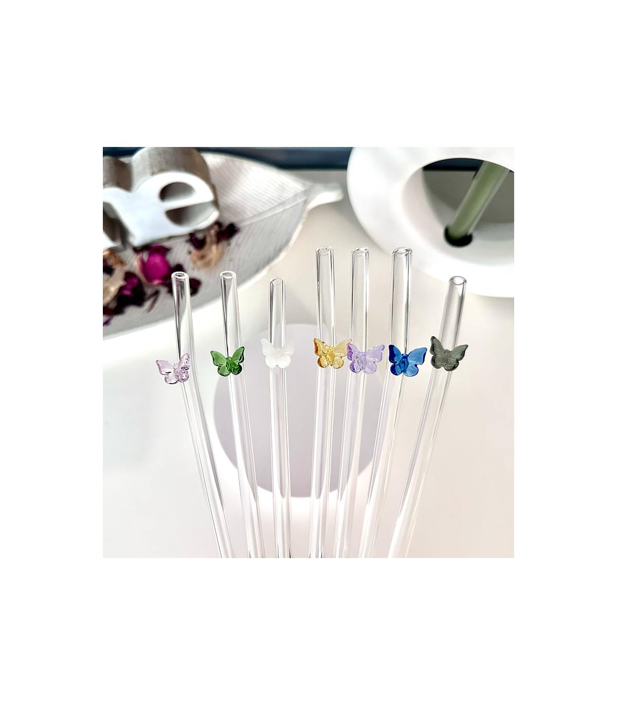 Pajita de Cristal con forma de "MARIPOSA" se puede limpiar con un limpia pajitas que incluye debajo del agua.