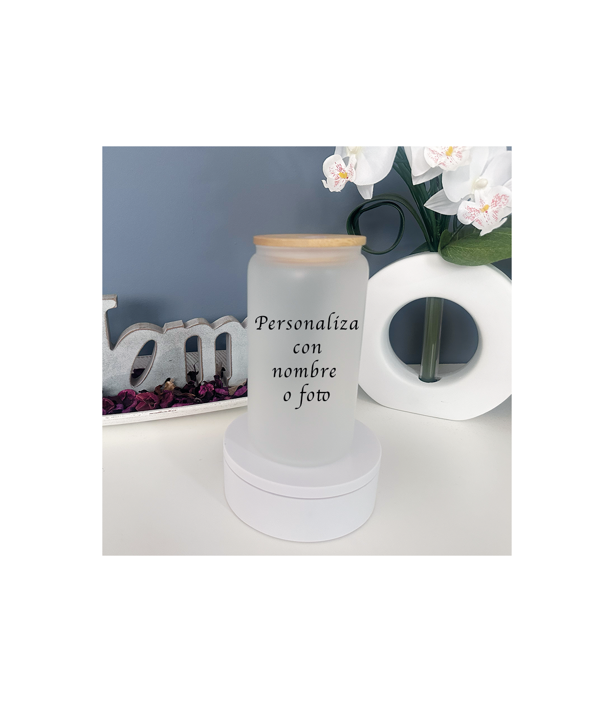 Vaso de cristal esmerilado con tapa de bambú, para personalizar con la foto que más te guste. Tan solo tienes que adjuntarla. Es un regalo perfecto. La tapa de bambú va con un anillo de silicona que evita salpicaduras para que pueda disfrutar de sus bebidas favoritas donde quiera que vaya. También lleva su pajita reutilizable.