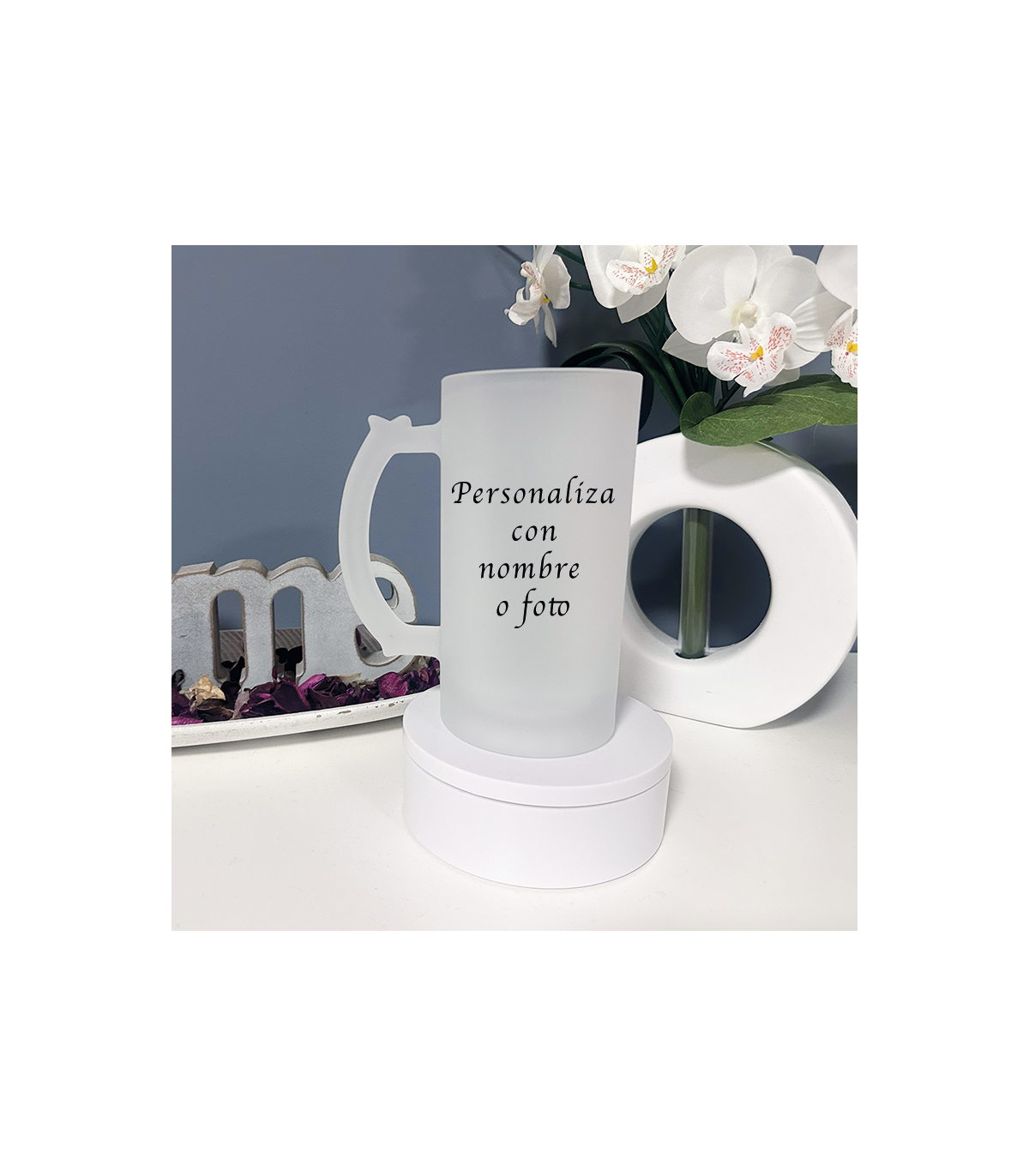 Jarra de cristal esmerilado para personalizar los momentos más bonitos. Solo tienes que adjuntar la foto con una buena calidad. Para las bebidas más refrescantes de verano, se puede meter en el congelador y tener tu jarra lista para echar tu cerveza más fresca o un refresco.