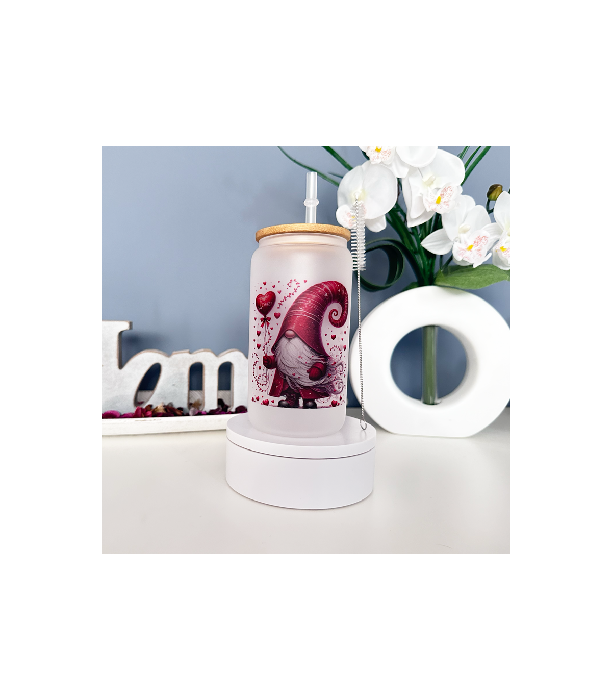 Vaso de Cristal opaco "Gnomo". Medidas: Diámetro 7 cm altura 15 cm con la tapa. Incluye una pajita de plástico duro reutilizable. Un regalo perfecto para cualquier celebración, como cumpleaños, comuniones, bautizos, bodas... Un regalo original que seguro aciertas.