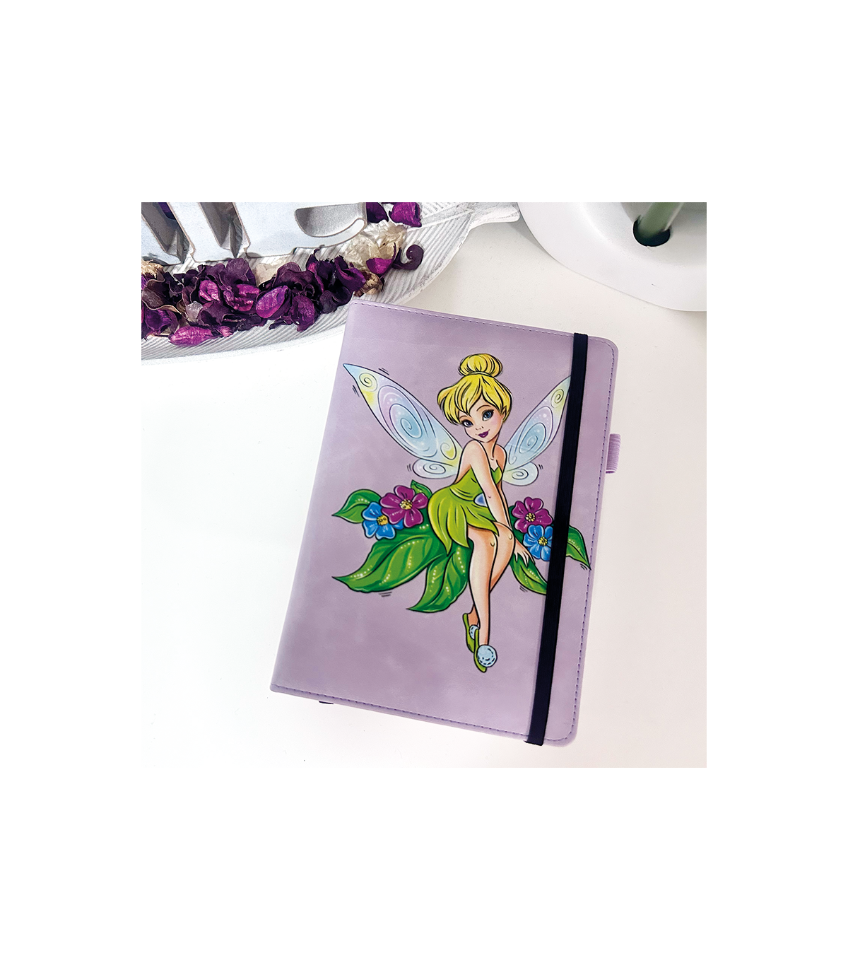 Cuaderno en polipiel, de rayas, color morado"Campanilla" tiene una goma elástica para cerrar el cuaderno, lleva bolígrafo incorporado.