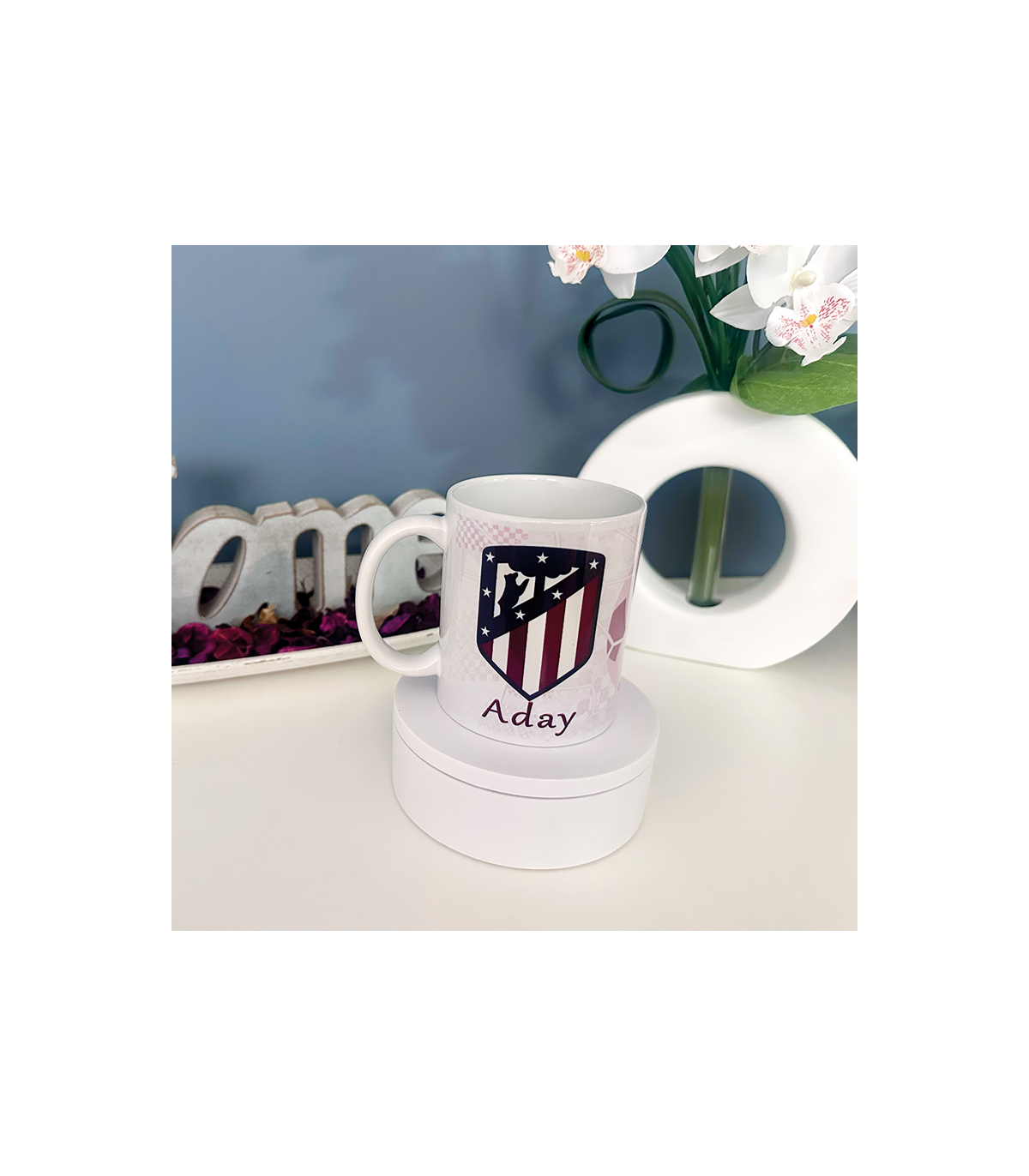 Taza de cerámica "Atlético de Madrid". Medida: Diámetro 8 cm altura 9,5 cm. Se puede personalizar solo tienes que adjuntar la foto y el texto, si no te deja todo o tienes algún problema en cargar la foto puedes escribir al correo.